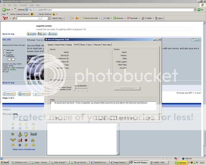 Go to start bar, go to run, type in dxdiag and press enter, then wait for the box to load up, then click on sound tab, see if it comes up with any errors, and also give me a screen shot of that.