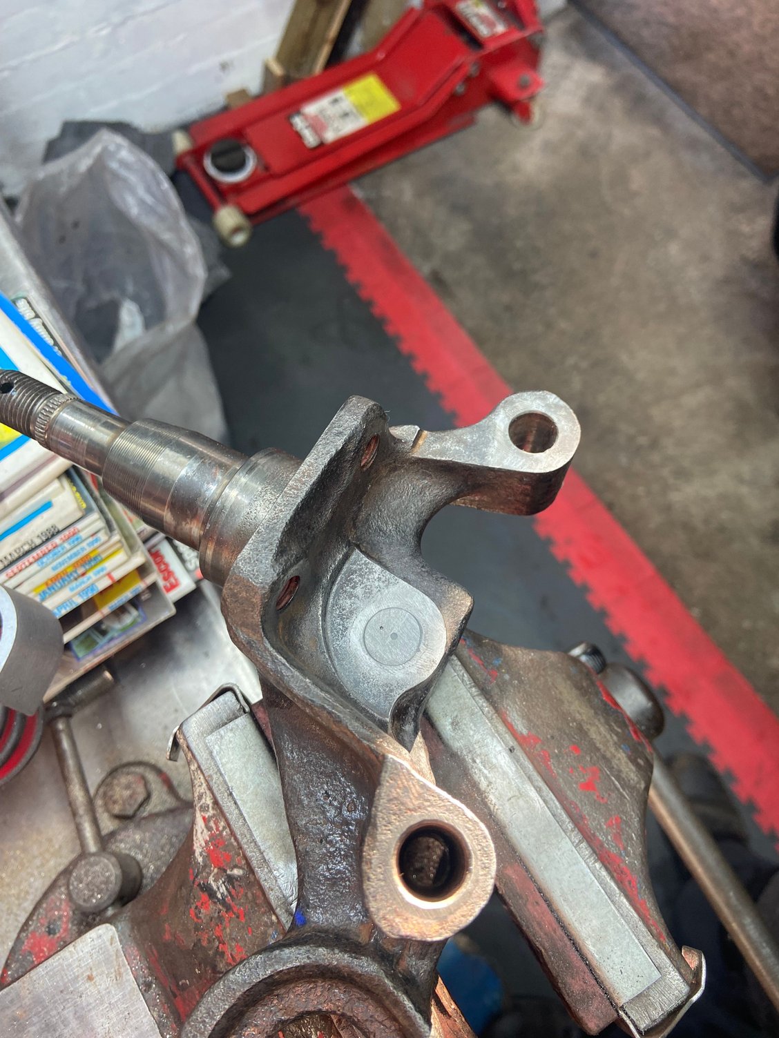 Double boot lamp nonsense. I made a brass plug to locate the hole centre. We’re lucky to have a small lathe, it comes in handy. Getting drilled All done. And the bolts still fit.