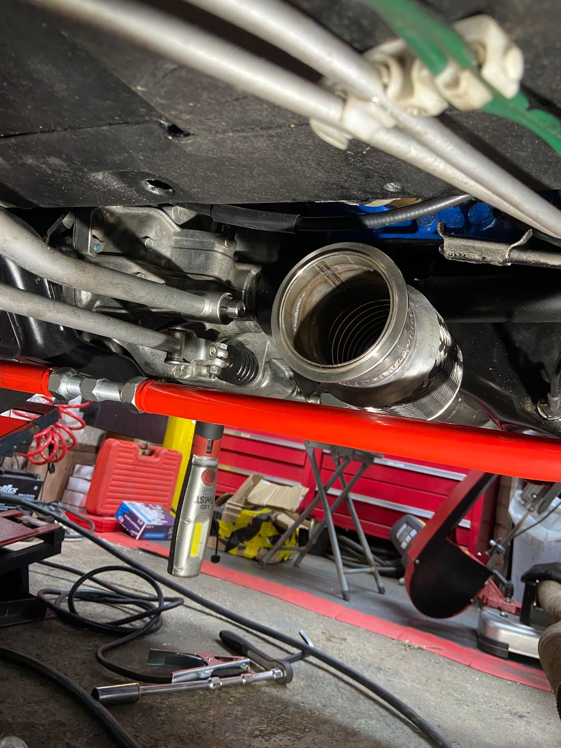 Just the Lambda bung to be welded. This bracket bolts to the gearbox. V band and back down to 2.5 Chassis brace. Aluminium spacer to tie the leg together.